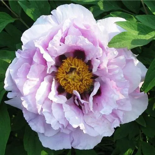 Пион "Синий сапфир" имеет внушительную высоту – до 120 см, образуя эффектные кусты. Его ярко-зеленые листья создают красивый фон для цветущих растений, а в период цветения на одном растении может распускаться от 30 до 70 крупных цветов диаметром около 18 см и высотой 6 см. Цветы обладают восхитительной окраской: в основании лепестков вы сможете увидеть темное чернильное пятно, которое плавно размывается к краям, переходя в мягкий тон от густо-лавандового до орхидейно-розового. Это двухцветное великолепие привлекает глаз и наполняет сад атмосферой романтики и нежности.
