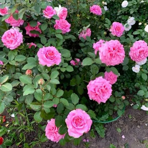 Цветки — главный акцент сорта. У Эшли они крупные, 10–12 см, густомахровые (более 40 лепестков), с классической чашевидной формой. Окрас насыщенный розовый, сохраняет глубину в жару и при ярком свете. Бутоны чаще формируются по одному на стебле, что делает сорт особенно удобным для срезки и создания букетов. Аромат мягкий, лёгкий — не доминирует и подходит тем, кто предпочитает нежный запах. Цветение длительное и повторное: несколько волн с начала лета до холодов, что позволяет долго наслаждаться декоративностью куста.